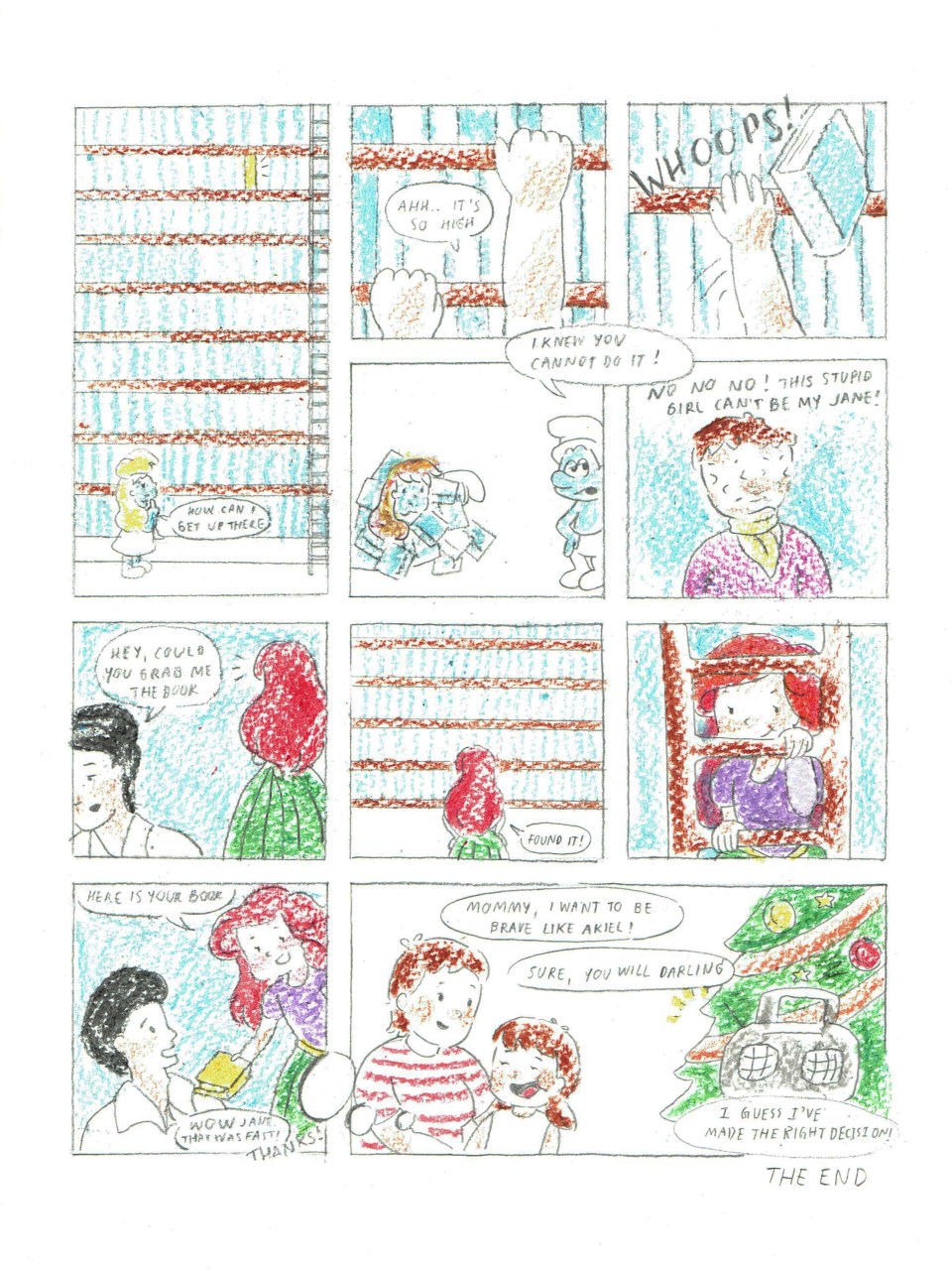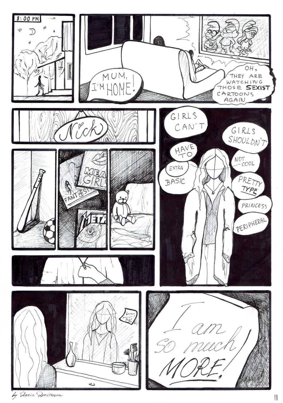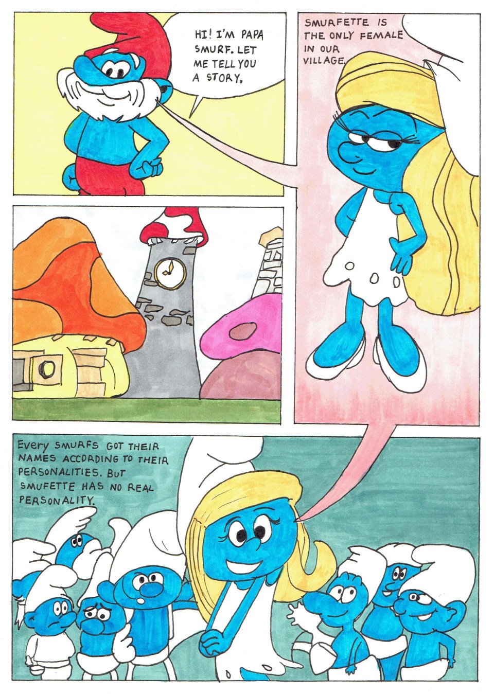 “The Smurfette Principle” comics (page 1/2) by 3rd year INDA student Daria Dmitrieva (INDA: International Program in Design and Architecture, Faculty of Arts, Chulalongkorn University). November 2017. Based on the Smurfette character created by Peyo; and Katha Pollitt’s Smurfette Principle.