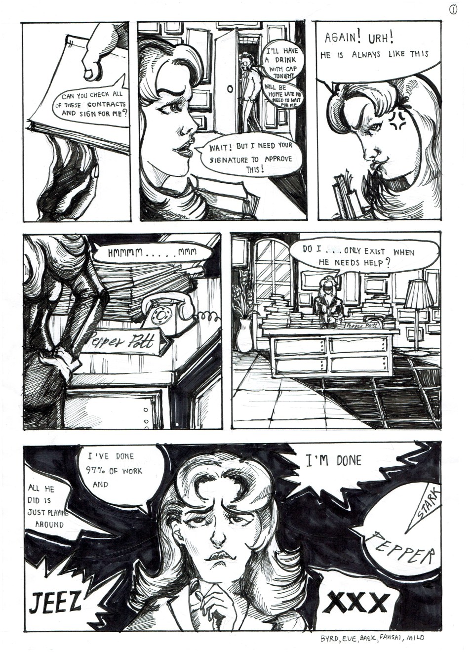 “The Smurfette Principle” satirical comics (page 1/4) by 1st year CommDe students Byrd, Eve, Bask, Fahsai and Mild. March 2018. Based on the Tony Stark/Iron Man character created by Stan Lee, Larry Lieber, Don Heck and Jack Kirby, and on the Virginia “Pepper” Potts character created by Stan Lee and Don Heck.“The Smurfette Principle” satirical comics (page 2/4) by 1st year CommDe students Byrd, Eve, Bask, Fahsai and Mild. March 2018. Based on the Tony Stark/Iron Man character created by Stan Lee, Larry Lieber, Don Heck and Jack Kirby, and on the Virginia “Pepper” Potts character created by Stan Lee and Don Heck.“The Smurfette Principle” satirical comics (page 3/4) by 1st year CommDe students Byrd, Eve, Bask, Fahsai and Mild. March 2018. Based on the Tony Stark/Iron Man character created by Stan Lee, Larry Lieber, Don Heck and Jack Kirby, and on the Virginia “Pepper” Potts character created by Stan Lee and Don Heck.“The Smurfette Principle” satirical comics (page 4/4) by 1st year CommDe students Byrd, Eve, Bask, Fahsai and Mild. March 2018. Based on the Tony Stark/Iron Man character created by Stan Lee, Larry Lieber, Don Heck and Jack Kirby, and on the Virginia “Pepper” Potts character created by Stan Lee and Don Heck.