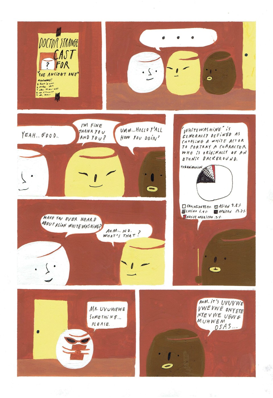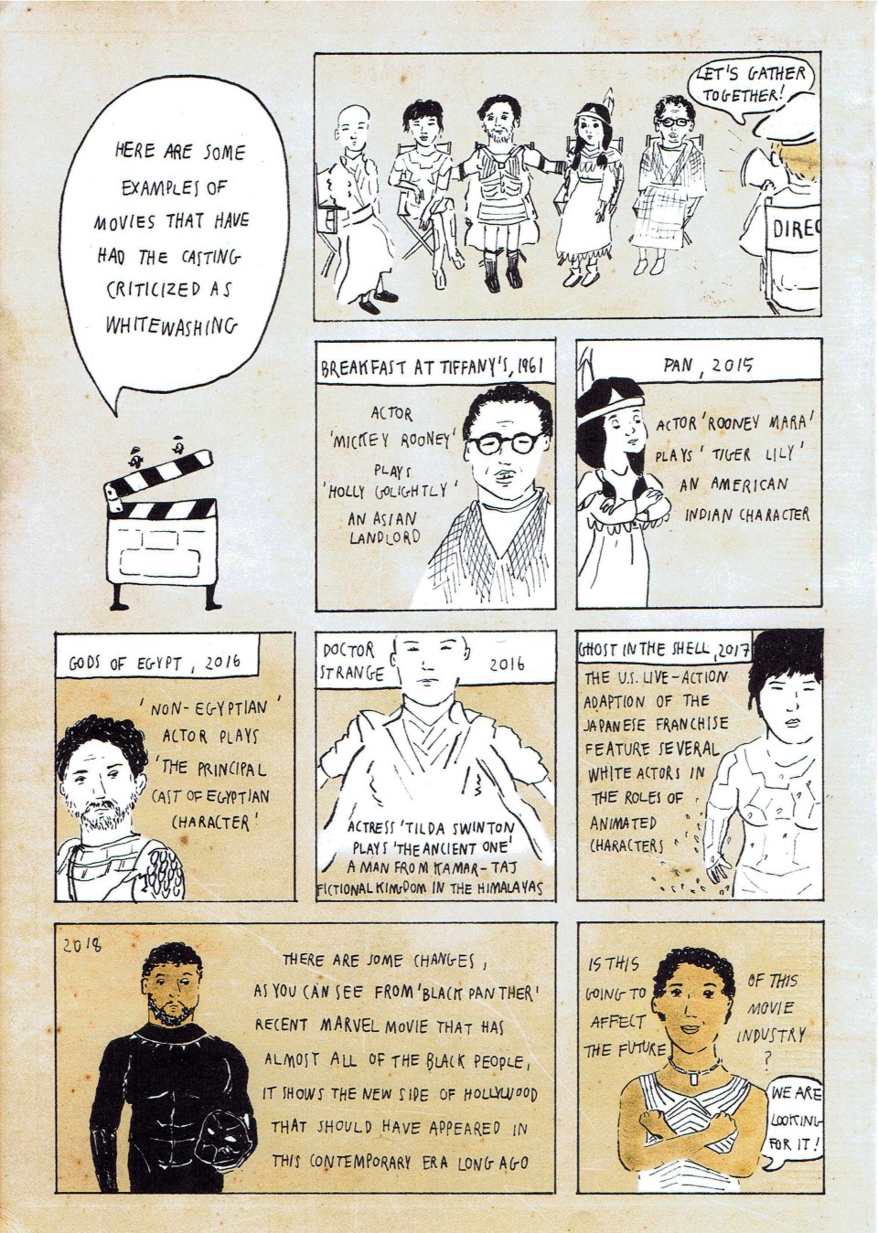 Thai (and foreign) Chulalongkorn students from the two courses mentioned above were asked to create short graphic narratives (2 to 4 pages) on imposed topics related to the Critical Tradition which challenges “the control of language to perpetuate power imbalances by exploring the way communication establishes, reinforces and maintains power structures in society” (see Denis McQuail, McQuail’s Reader in Mass Communication Theory, Sage Publishing, 2002). With a vast majority of Asian and female students in my courses, the Smurfette Principle and Whitewashing in Film topics seemed to be appropriate and meaningful choices. The latter topic addresses the under-representation of minorities in the media, and more specifically the Hollywoodian habit of casting white actors to play non-white characters while disregarding the -mostly comics- source material (see articles by Steve Rose and Keith Chow). Infamous recent examples include Tilda Swinton casted as a Himalayan mystic in Doctor Strange, Emma Stone casted as a Chinese-Hawaiian character in Aloha, Scarlett Johansson playing a Japanese cyborg in the live-action feature Ghost in the Shell, or British actor Ed Skrein who decided to step down from his (half-Japanese) Ben Daimio’s role in the upcoming reboot of Hellboy. Criticism on cultural appropriation and whitewashing has also been raised towards Wes Anderson’s latest feature Isle of Dogs (see here).