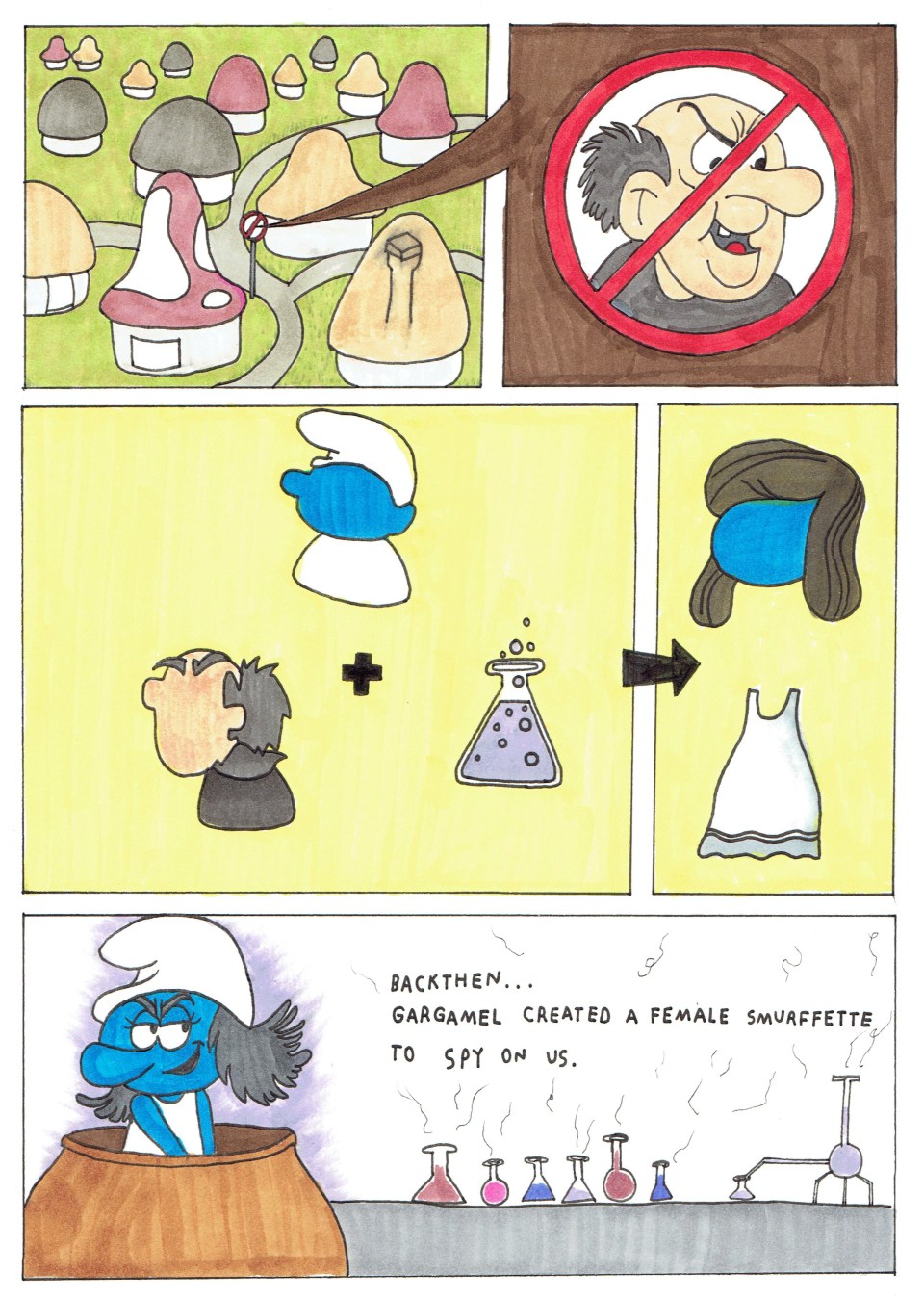 “The Smurfette Origin” Comics (exploring elements from the Semiotics lessons: symbol, icon, connotation; and with a nod to Ibn al Rabin’ silent comics), page 1/3, by 1st year CommDe students Prim, Proud, Pauline, Pop and Suang. March 2018. Based on characters created by Peyo.“The Smurfette Origin” Comics (exploring elements from the Semiotics lessons: symbol, icon, connotation; and with a nod to Ibn al Rabin’ silent comics), page 1/3, by 1st year CommDe students Prim, Proud, Pauline, Pop and Suang. March 2018. Based on characters created by Peyo.“The Smurfette Origin” Comics (exploring elements from the Semiotics lessons: symbol, icon, connotation; and with a nod to Ibn al Rabin’ silent comics), page 1/3, by 1st year CommDe students Prim, Proud, Pauline, Pop and Suang. March 2018. Based on characters created by Peyo.