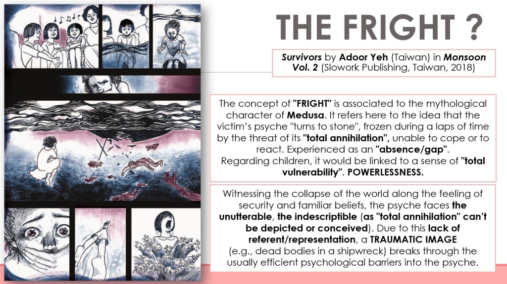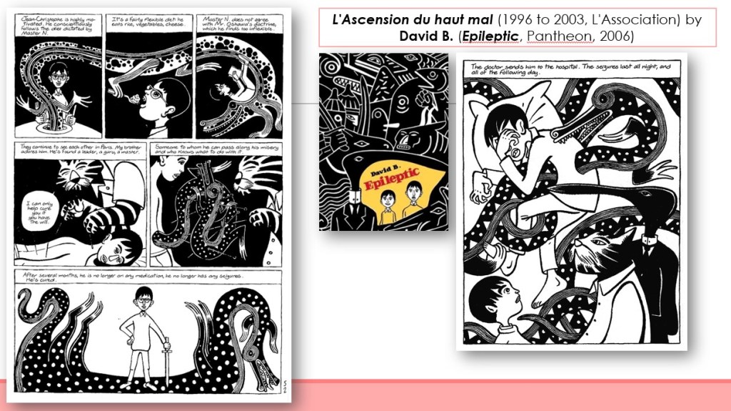 When abandoned by words, muted or silenced, Comics Art allows for different strategies to represent -or allude to- ‘invisible/invisibilized’ inner wounds, health and mental issues. These -usually overlapping- meaning-making strategies include, but are not limited to, the narrative use of colors, art/line style, textures and techniques (pencils, ballpoint pen, digital paint…), graphic embodiment of the characters, space-time interplay (space as time; contiguity of various moments/spaces/panels), braiding of visual motifs and visual metaphors, panels’ sizes and shapes, page composition (segmentation, layout, negative space…), text spatialization, speech balloons’ shapes and lettering, multi-modality (text-image dynamic; anchorage/relay, intertextuality), abstraction or suggestion (closure, gap between the panels). More on ‘the interaction between the medium of comics and the discourse of healthcare’, and the representation of (psychic) trauma, can be found on the website Graphic Medicine, and books such as Documenting Trauma in Comics: Traumatic Pasts, Embodied Histories, and Graphic Reportage (Palgrave Macmillan), Hillary L. Chute’s Disaster Drawn: Visual Witness, Comics, and Documentary Form (Harvard University Press), Harriet E. H. Earle’s Comics, Trauma and the New Art of War (University Press of Mississippi) and Eszter Szép’s Comics and the Body: Drawing, Reading, and Vulnerability (The Ohio State University Press) among many other publications.