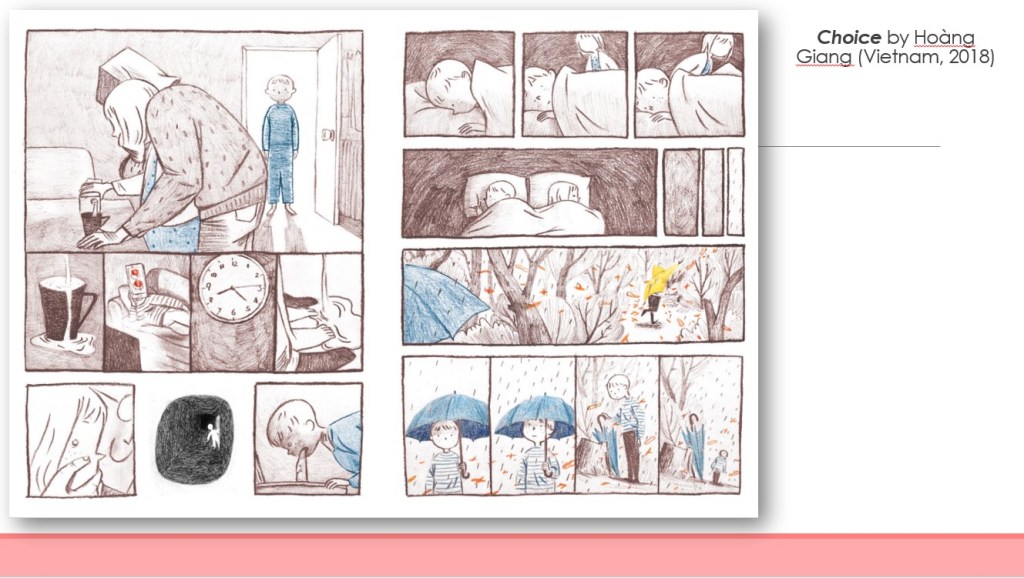 The following 17 ‘Traumics’ (comics on trauma) or Graphic Medicine narratives were produced by Thai or exchange students from various faculties (Psychology, Architectural Design, Language and Culture, Communication Design, Communication Arts, Engineering) at Chulalongkorn University, Thailand, during the Covid-lockdowns in 2021 and 2022 as the final creative projects of two of my courses: Imaginative Media, a comparative course on the representation of Refugee Narratives and Psychic Trauma in various media (literature, comics, movies, tv series, dance/choreographies, paintings…), and Visual Media Studies, a ‘General Education’ course mostly dedicated to the study of Graphic Narratives and Comics Art. Both courses include the study of Psychic Trauma and its representations through a series of lessons based on the seminal works of psychiatrists François Lebigot, Louis Crocq and Sándor Ferenczi, and on my conferences on Comics as a Language of Symptoms of Psychic Trauma. All students were made aware of the challenging nature and content of the courses on the first lesson (and could choose to drop the course, or skip the triggering content/lessons); they were free to select their graphic narrative’s topic, but it had to be related to psychic trauma or any other mental/health issues, and to change their topic at any point, if the ‘graphic’ composition felt too challenging. Some stories are based on personal experiences, other are based on research by the students. In preparation of the composition of their graphic narratives, we’ve analysed pages from a dozen trauma-related short comics or graphic novels from the US, Canada, Taiwan, Vietnam, Belgium or France. Along the semester, students worked on various (constrained/experimental) comics composition assignments. During the last weeks of the semester, individual consulting sessions with yours truly were held, one to discuss the first layout and a second to improve some elements of the advanced draft of their comics. Most of the students had no prior art/comics training, and the following stories are usually their very first comics narratives. Most stories reveal the crushing weight of social pressure/conformity in Thailand (and Asia), and that -if comics studies were rightfully considered and fully integrated in the university curriculum- students would be able to produce many more sophisticated and meaningful graphic narratives on social issues and as a means of self-expression and of mindful communication.