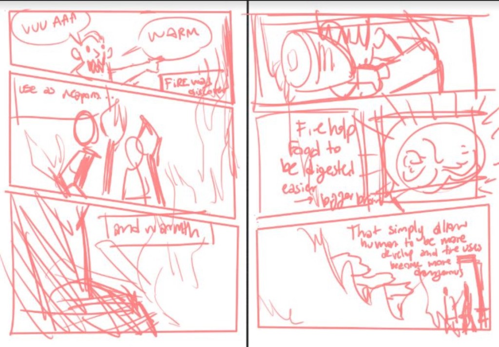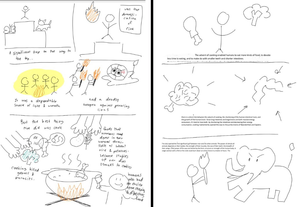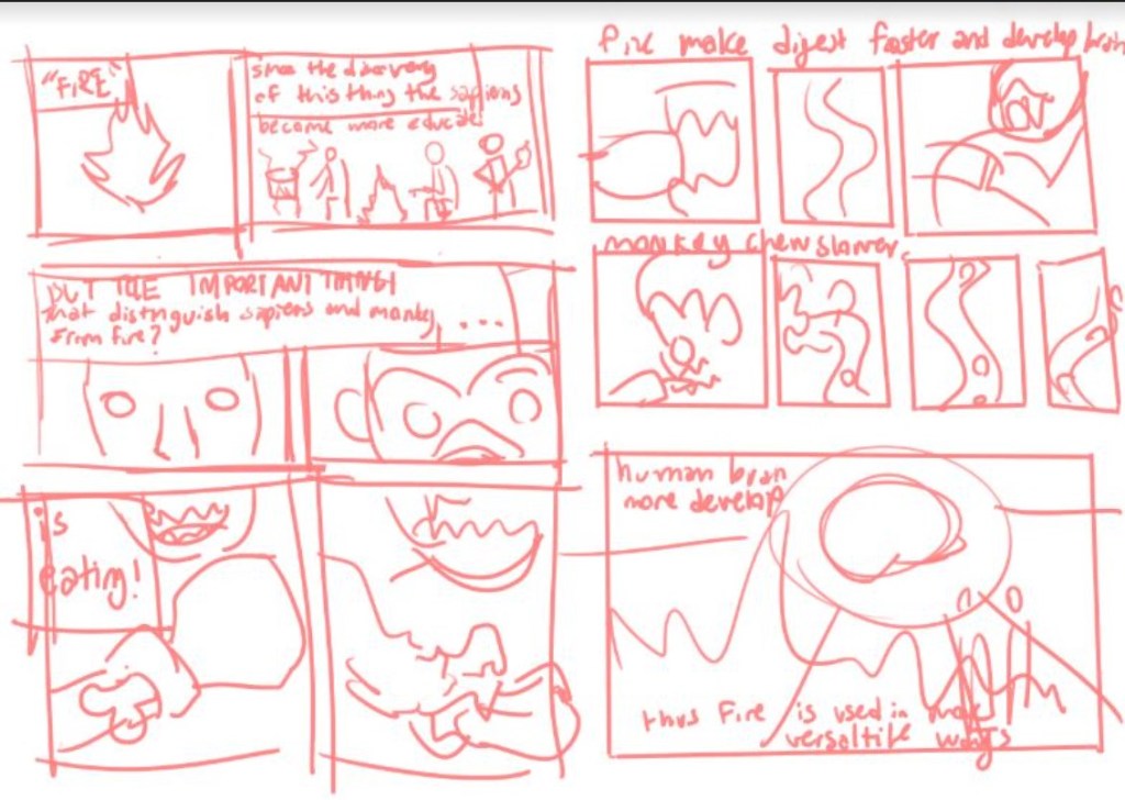 The workshop consisted in applying the various graphic non-fiction composition techniques discussed during the guest lecture to the comics adaptation of an imposed paragraph excerpted from the chapter A Race of Cooks in Yuval Noah Harari‘s book Sapiens: A Brief History of Humankind (2011/2015). The 35 participating students -from Faculties and Departments of Literature, Architecture, Communication Design, Communication Arts, Psychology and Chemistry- had 30 minutes to compose individually a 2-page comics breakdown (drawn draft) of the paragraph. After completion, Aurel’s own graphic take on the Sapiens paragraph in his comics Singes and David Vandermeulen & Daniel Casenave’s comics adaptation in Sapiens: A Graphic History were introduced to the students to compare radically different approaches. Each student’s comics breakdown was later commented individually by yours truly.